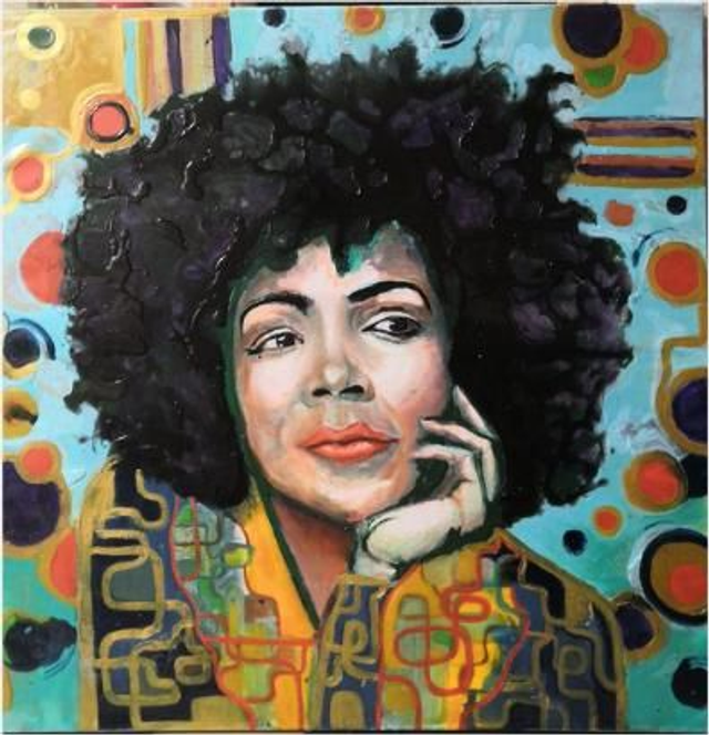 Tableau original “Jasmine” représentant une femme style "afro", qui regarde relaxée au loin en pensant a son avenir.
